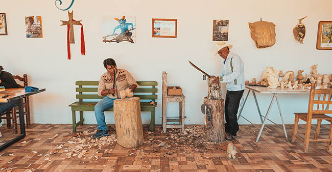 We also carved animal figures, inspired by what we saw around us and those we had at home, such as dogs, cats, bulls, etc., as well as representations of the life of our people, such as the lady making tortillas, the farmer and his team. What I liked most was that we didn't need special tools. We used what we had at home: the machete we used in the fields, knives, wooden mallets, or any other tool that could help shape the wood the way we wanted. It was slow and complicated work because we didn't have the slightest knowledge of how it was made, but every little piece of wood we removed brought us closer to the final creation.