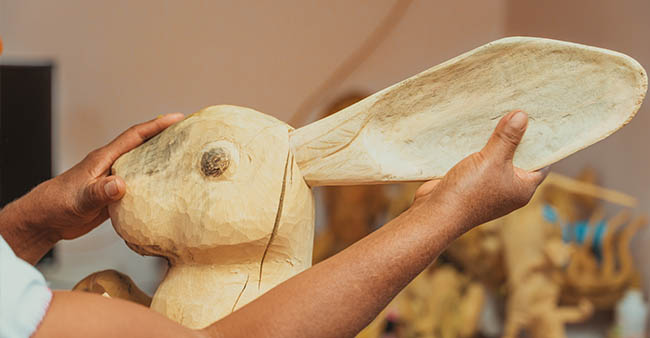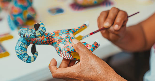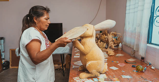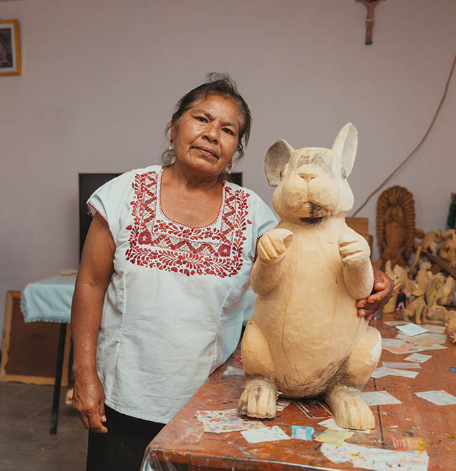En el taller de tallado en madera ubicado en San Martín Tilcajete, Ocotlán de Morelos, que comparte con sus hermanos Cándido, Alberto y Aarón, María pinta las piezas que sus hermanos elaboran: figuras como conejos, cerdos, tucanes, gacelas, perros y, por supuesto, ángeles y vírgenes. El pincel se desliza suavemente y se aprecian los diseños de flores y mariposas, lo que hace que las figuras sean más coloridas y vistosas, adquiridas por coleccionistas.