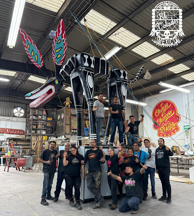 Somos un colectivo versátil que no se encasilla en un solo tipo de proyecto. Hemos diseñado desde alebrijes iluminados para desfiles y esculturas itinerantes, hasta escenografías completas para eventos masivos. Entre nuestros proyectos más emblemáticos destacan la fabricación de los escenarios principales del festival Vive Latino (2022-2025), esculturas para el EDC México desde 2021, y la participación con piezas monumentales en la película "James Bond 007: Spectre". Además, hemos llevado nuestras obras al extranjero, como al festival **lile Ville** en Francia, y somos proveedores destacados del Day of the Dead River Parade en San Antonio, Texas.